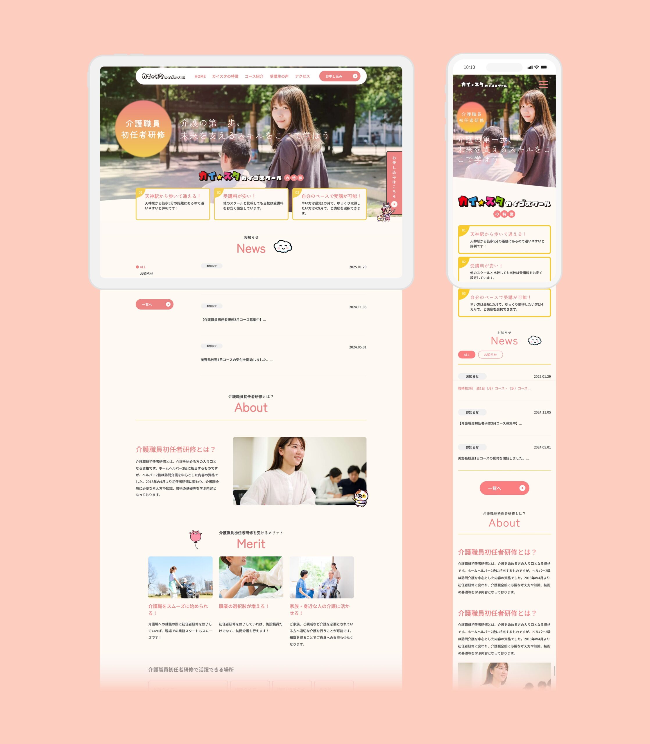 福岡の企業様からご依頼があった案件です。既存サイトはあったものの、デザインや導線の見直しを目的にリニューアルを検討されていました。運営されている介護資格スクールが2種類あり、初任者研修と実務者研修それぞれに対応したサイト制作をご希望でした。